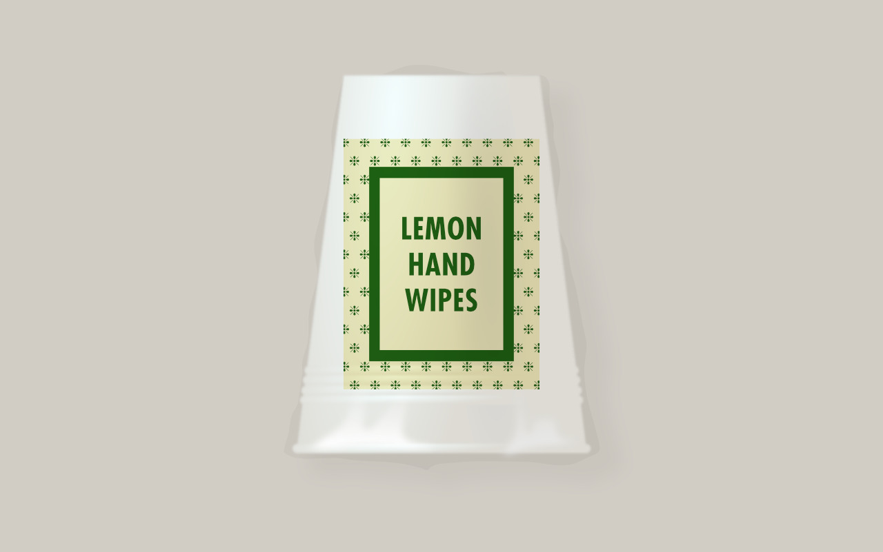 Wrapped plastic cups (labeled as “lemon hand wipes”) found on a cart in a hotel lobby.